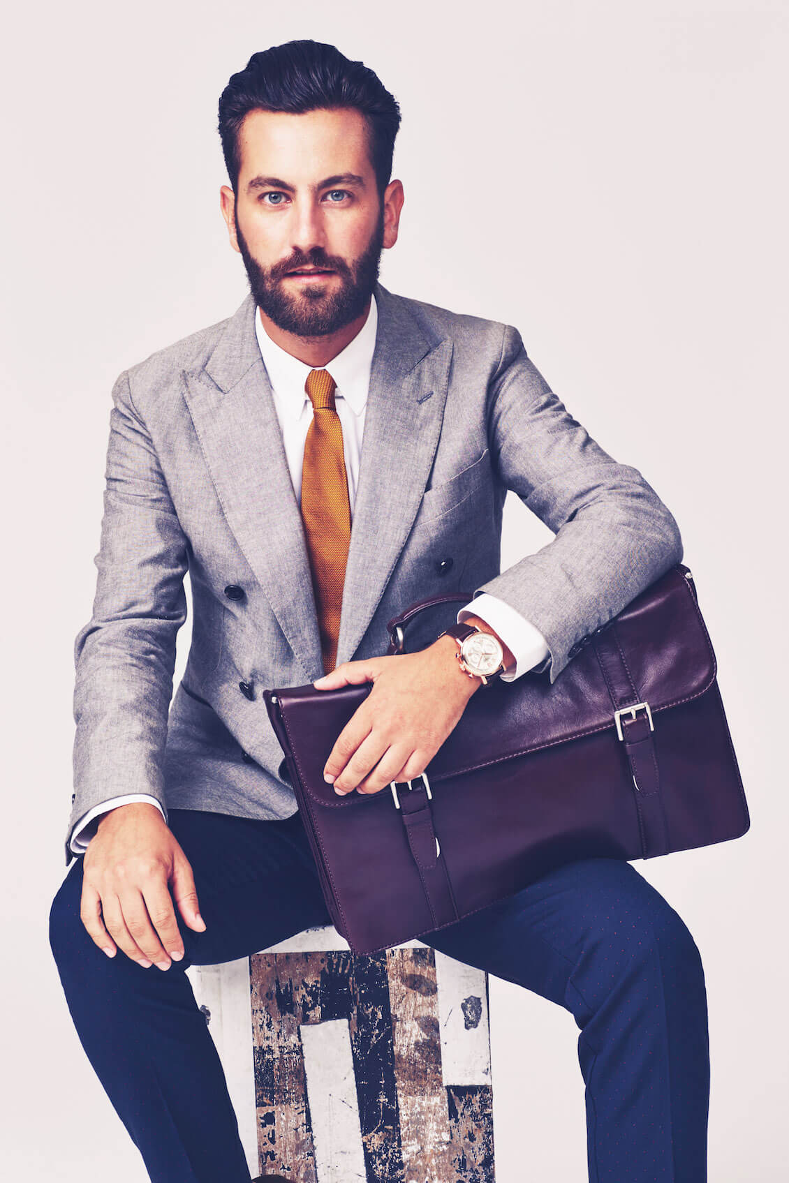 Me- Jacket, Shirt and Tie: Hardy Amies, Thompson Portfolio Brief and Buchanan Watch: All by Fossil