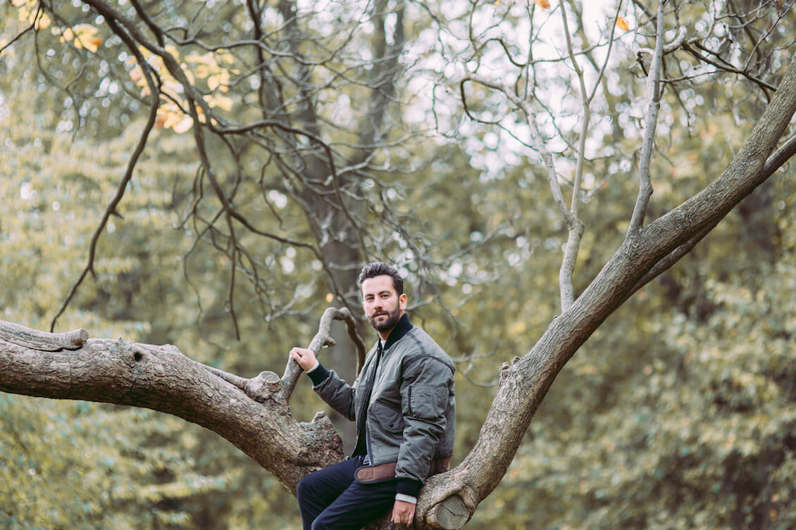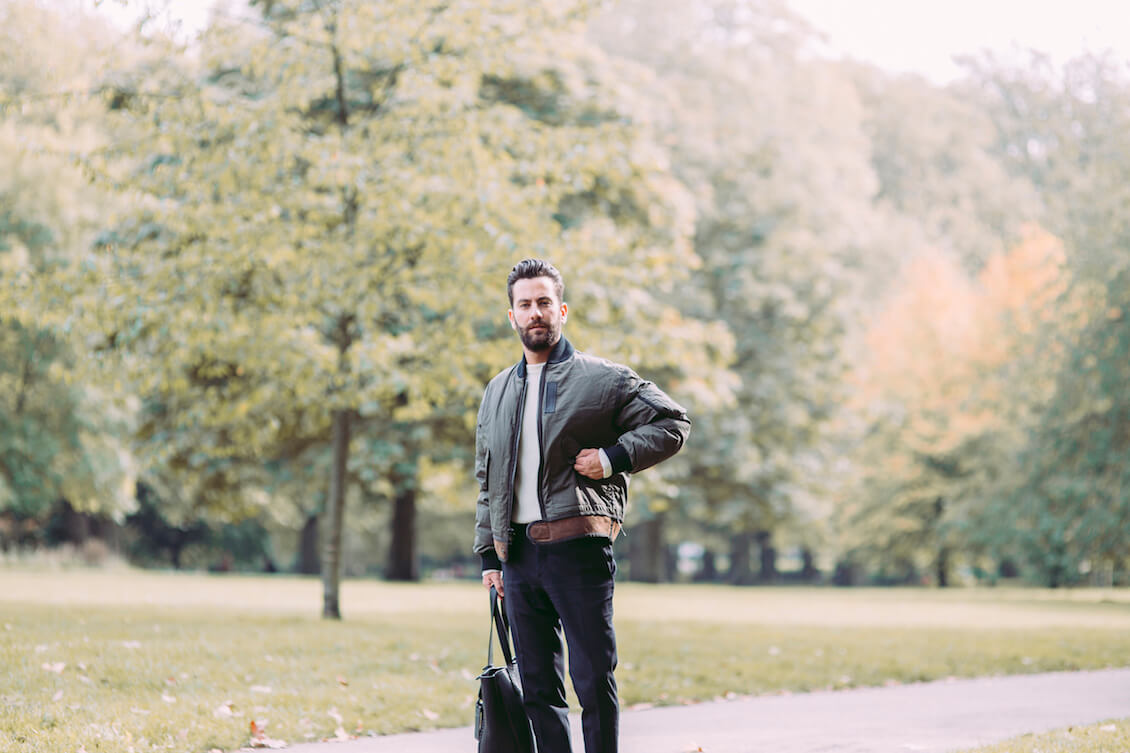 The Olive Green Cotton-Blend Bomber Jacket that I am wearing carries the feeling of fall through its irreverent American style whilst staying functional for the everyday gentleman.