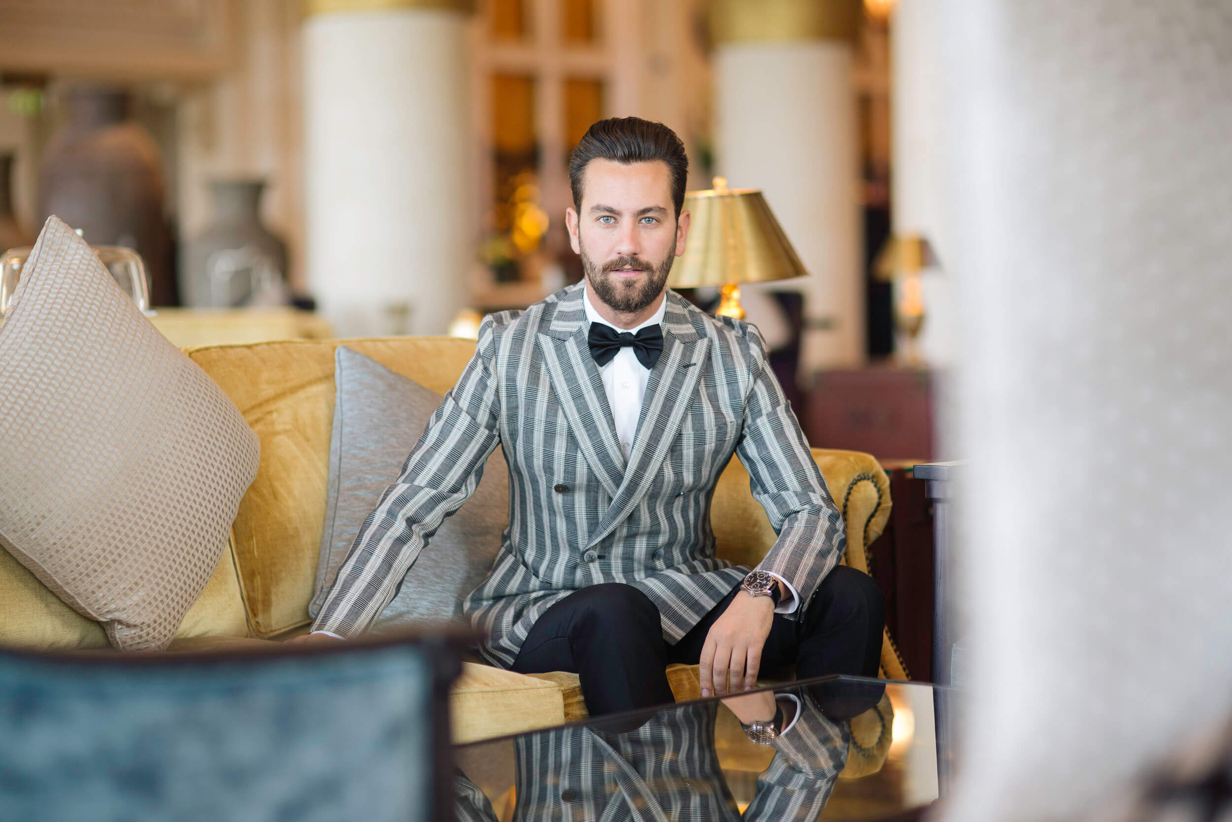Jacket: Hardy Amies, Shirt, Trousers and Bowtie: Dsquared2, Loafers: Gucci, Watch: IWC