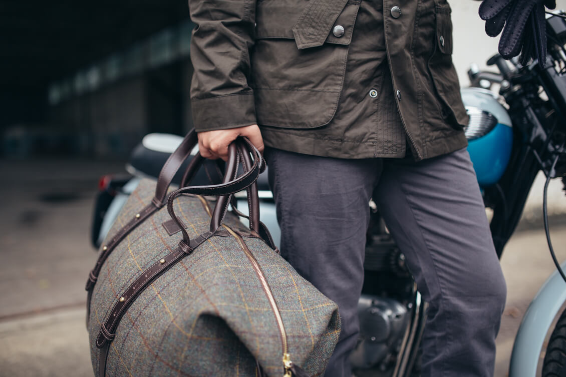 Shirt, Knitwear, jacket, chinos, weekend bag: All by Hackett, Boots: Bally, Gloves: Dunhill