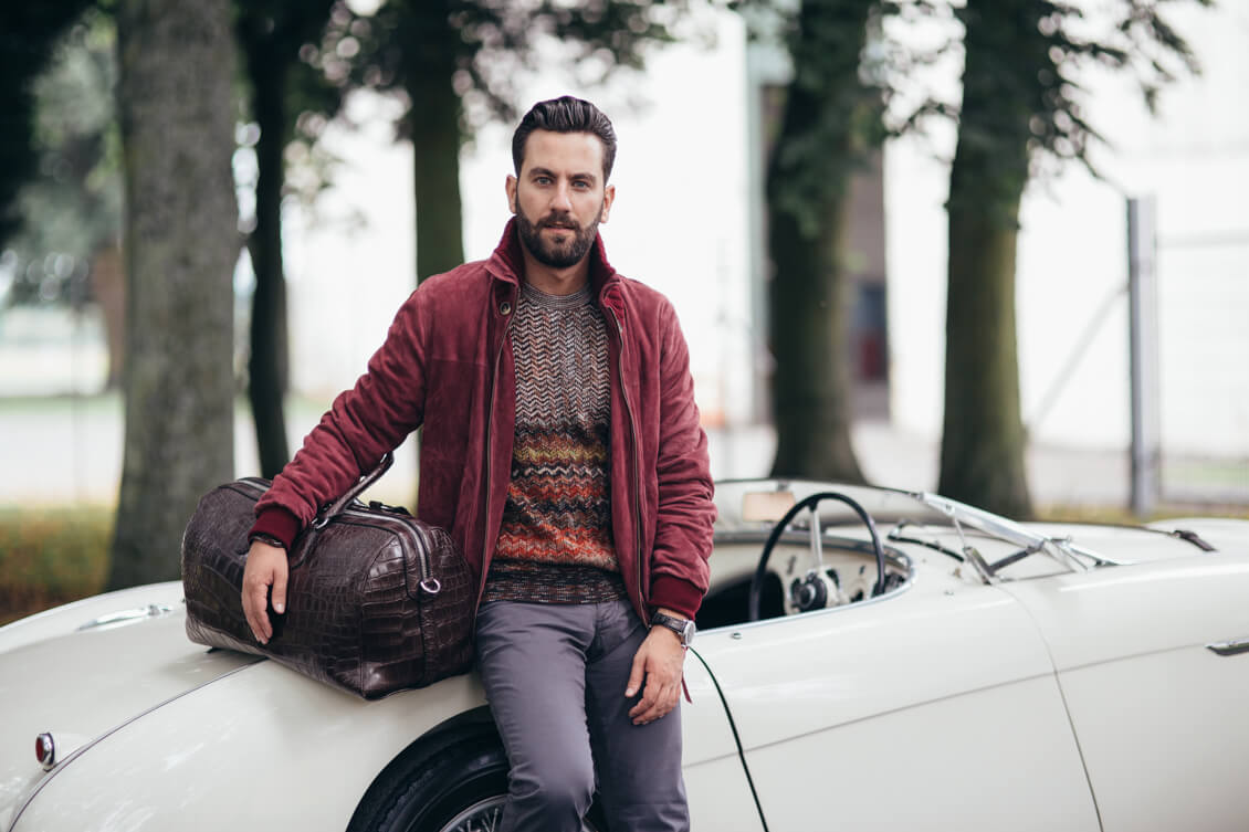 So, now it’s time for some inspiration for my first weekend getaway of the new season. Nothing says autumn has arrived quite like a fine suede jacket, thus I picked a cool Missoni red jacket with loom knit wool insets on sleeves and back and paired it with a Missoni wool sweater. Ideal for the first September chills! A casual look needs a cool tailored chino like the one I got from Hackett. Its comfort and slim fit makes it a must for every modern man. Taking comfort to the next level, I picked these extra comfort and stylish Bally military boots from leather so, no need to worry about walking in the autumn rain.