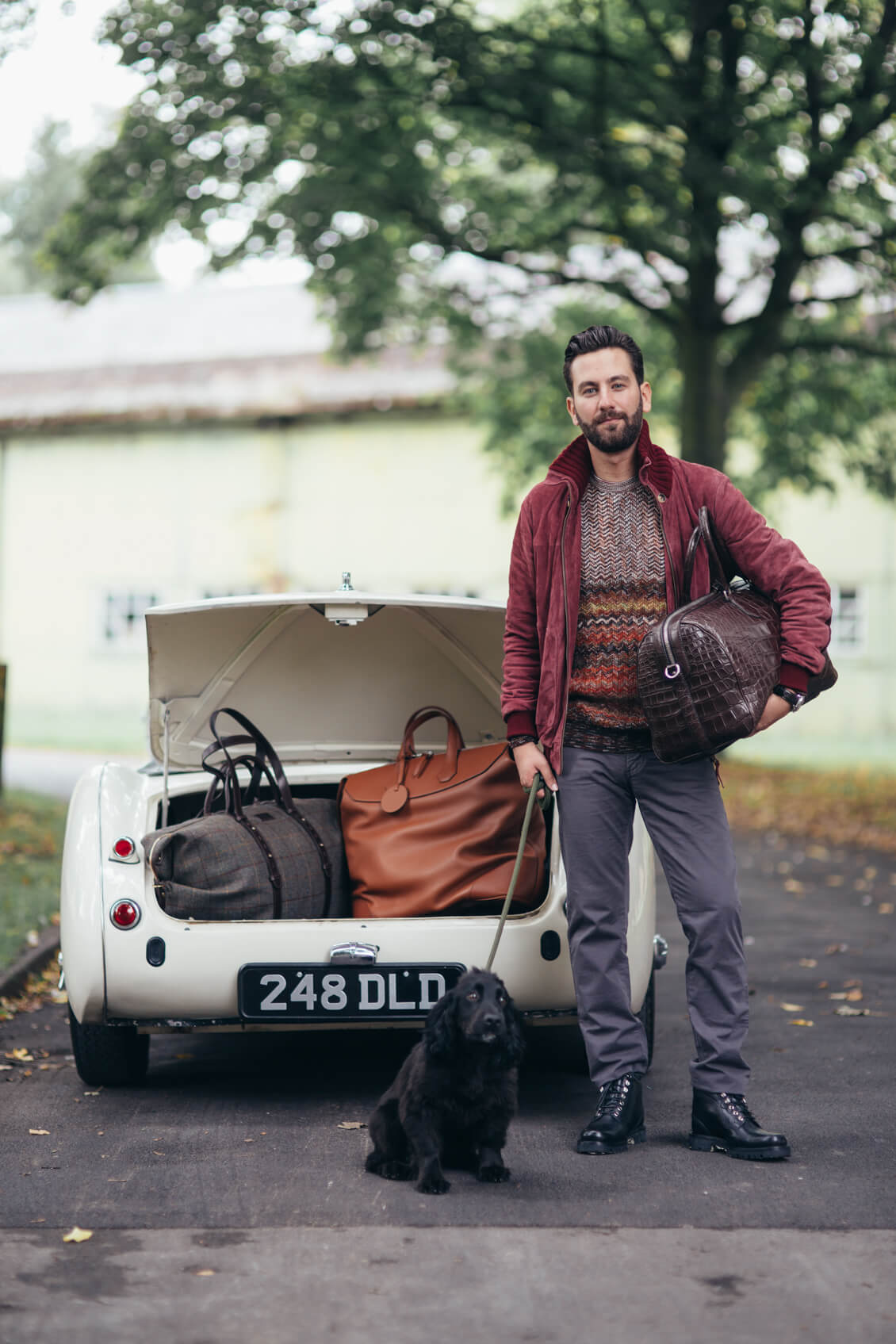Knitwear and Jacket: Missoni, Chinos: Hackett, Boots and Crocodile Brown Bag: Bally, Light Brown Bag: Dunhill, Tartan Weekend Bag: Hackett.