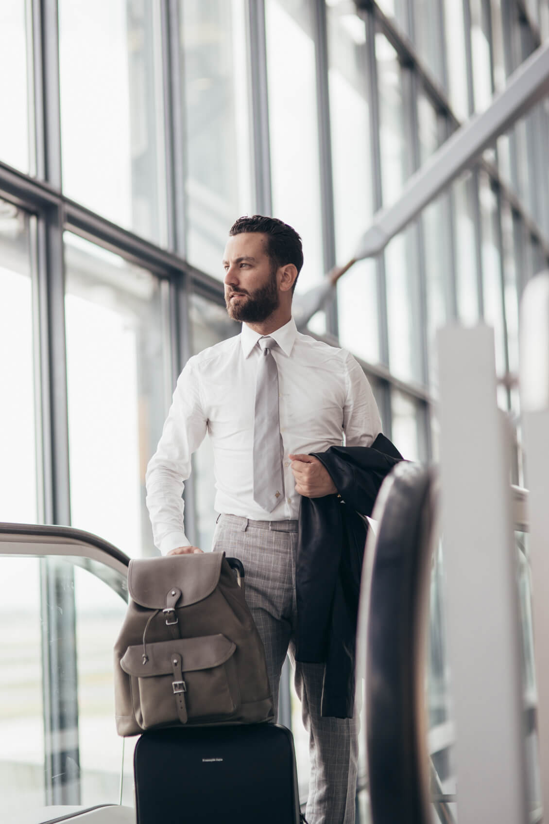 Reiss suit and shirt, Paul Smith tie and briefcase, Ermenegildo Zegna suitcase, Magnanni shoes from Kurt Geiger.