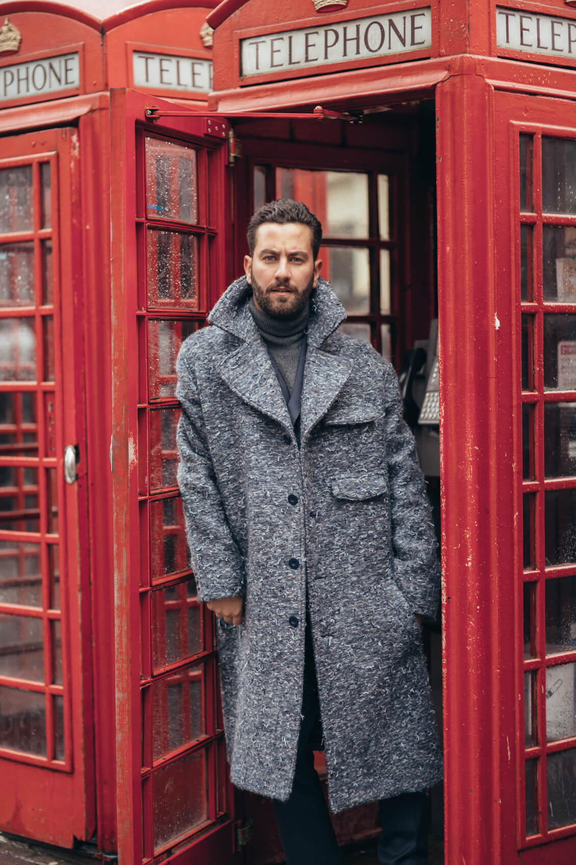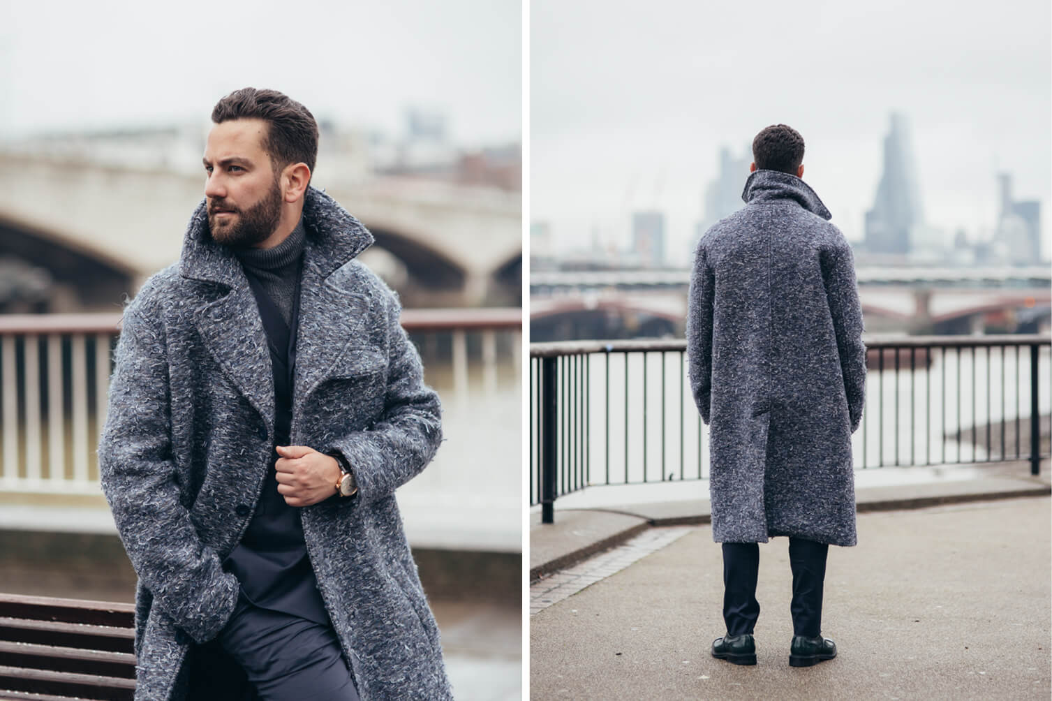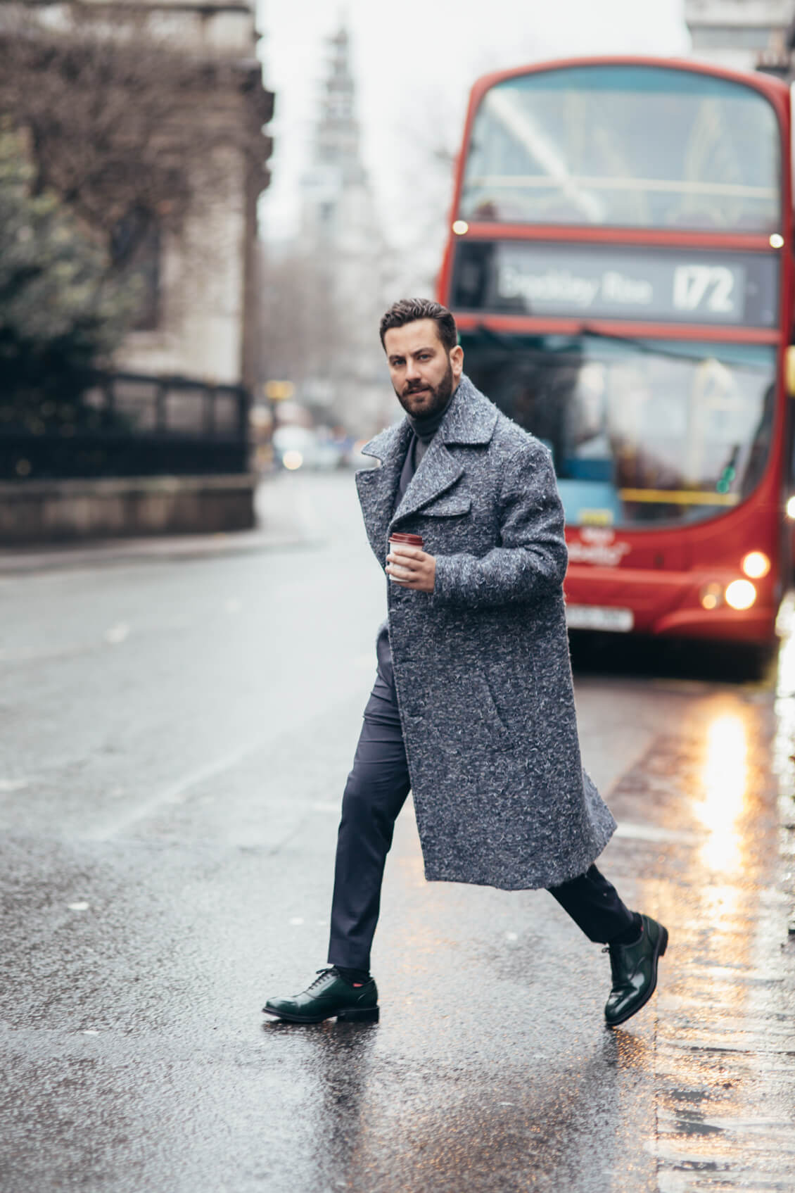 For London Fashion Week Men Day Two I woke up to a completely grey London sky with a foggy and misty undertone to the city’s skyline. I couldn’t help myself but lean towards the same colour palette for the day’s outfit. The main feature is my Qasimi grey wool textured coat. It offers the right amount of cosiness to this winter day without compromising the dapper of the look. As suspected I paired this with a Dsquared2 charcoal navy suit, and green Church’s shoes. Wrapping up and exposing as little as possible to the bitty cold, is what will make me last all day.