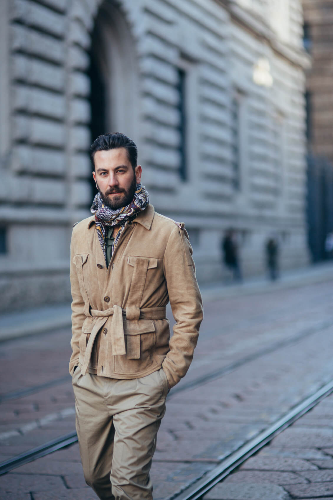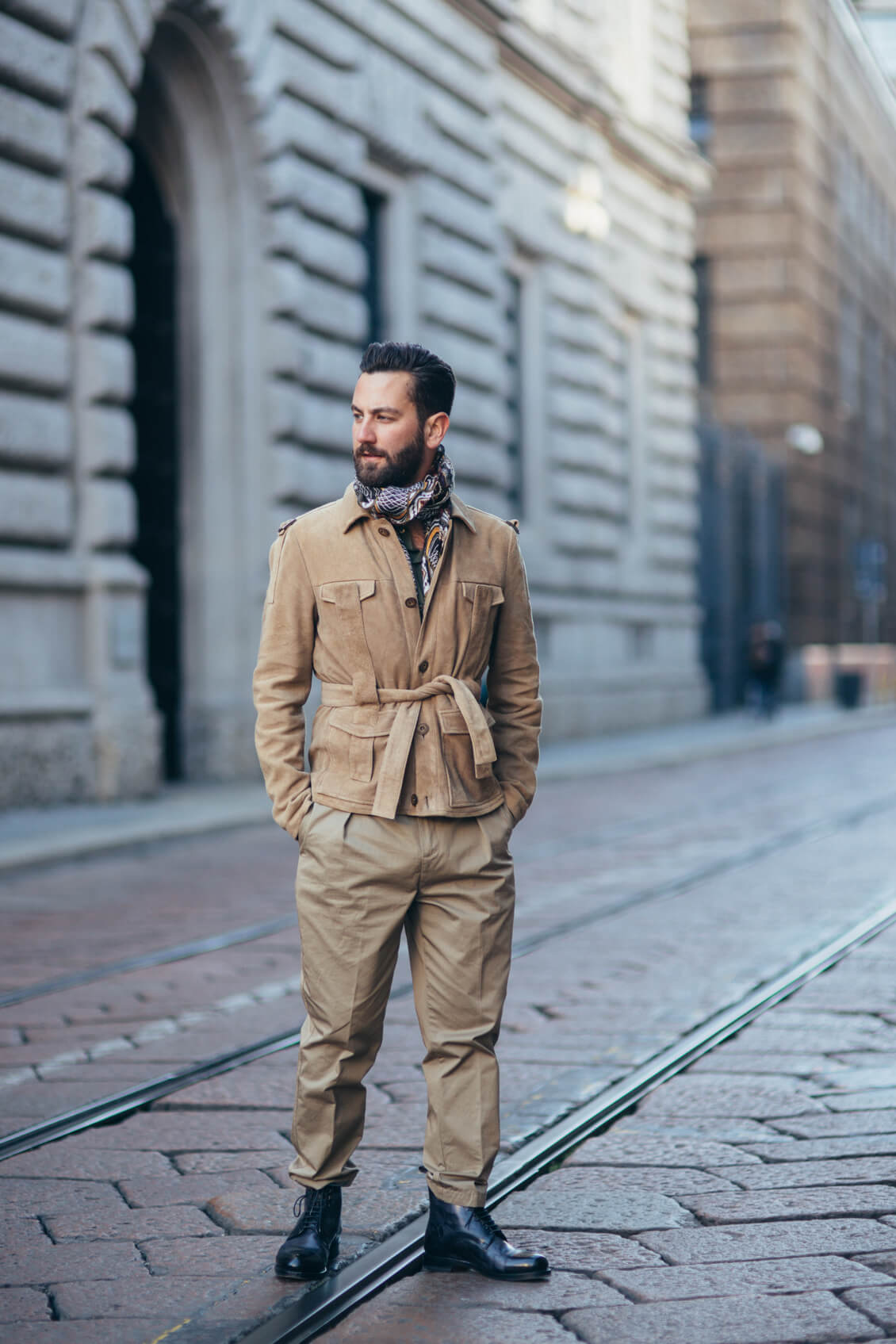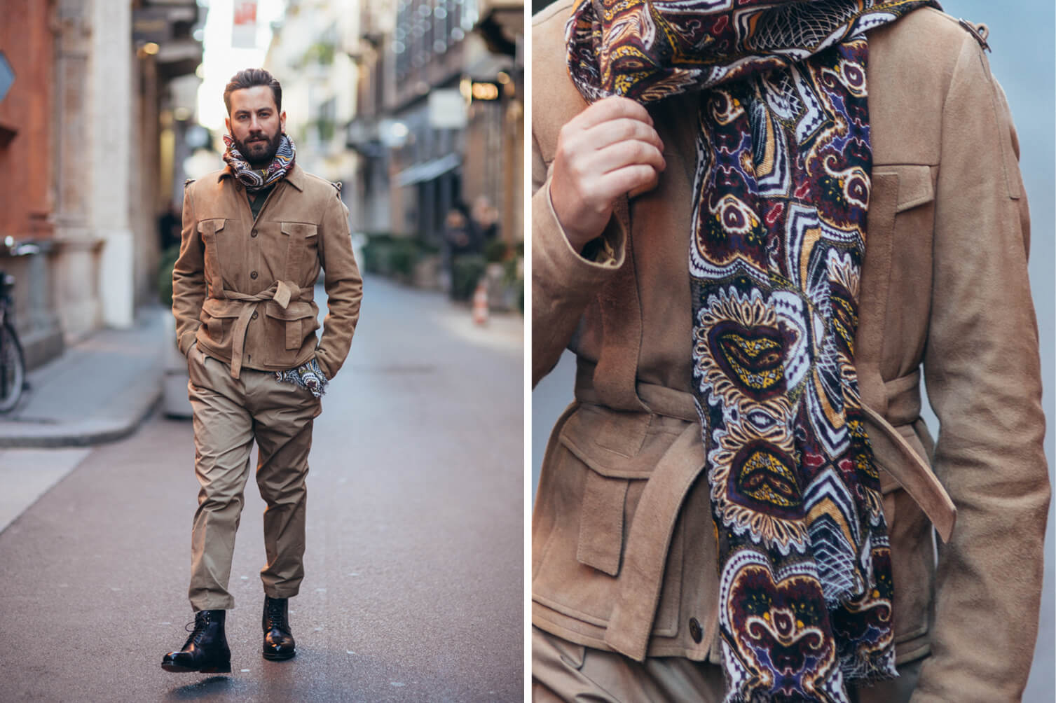 Jacket, Shirt, Scarf and Trousers: Etro, Boots: Santoni
