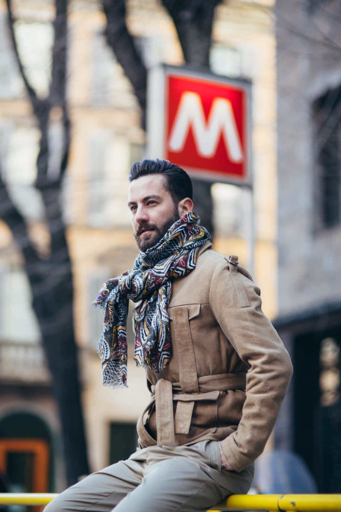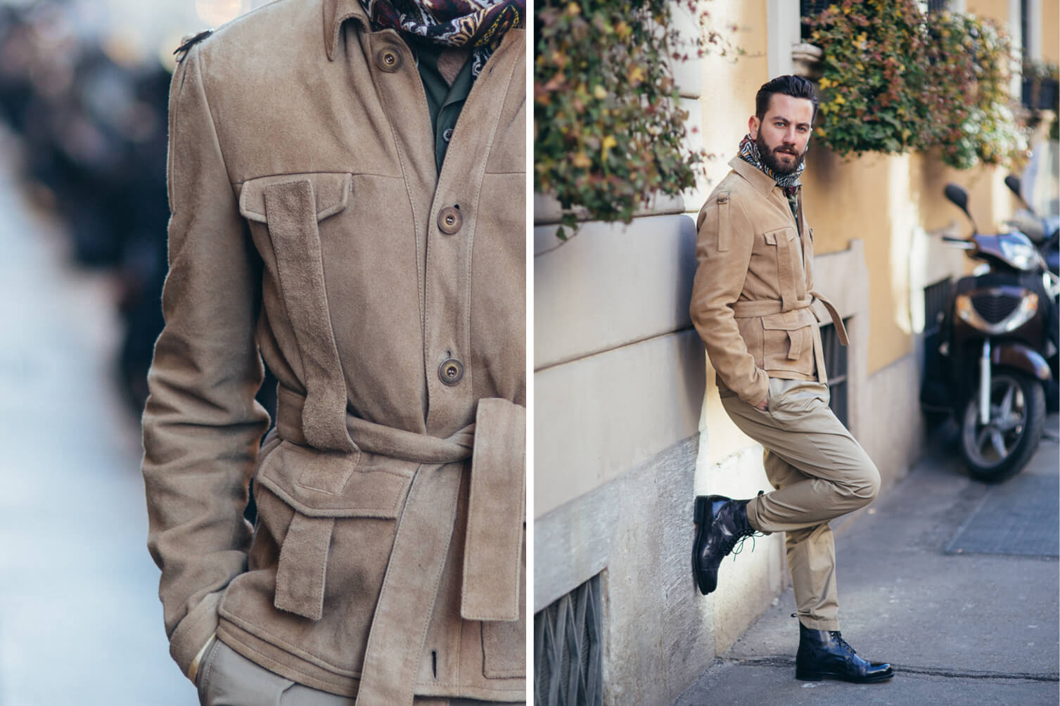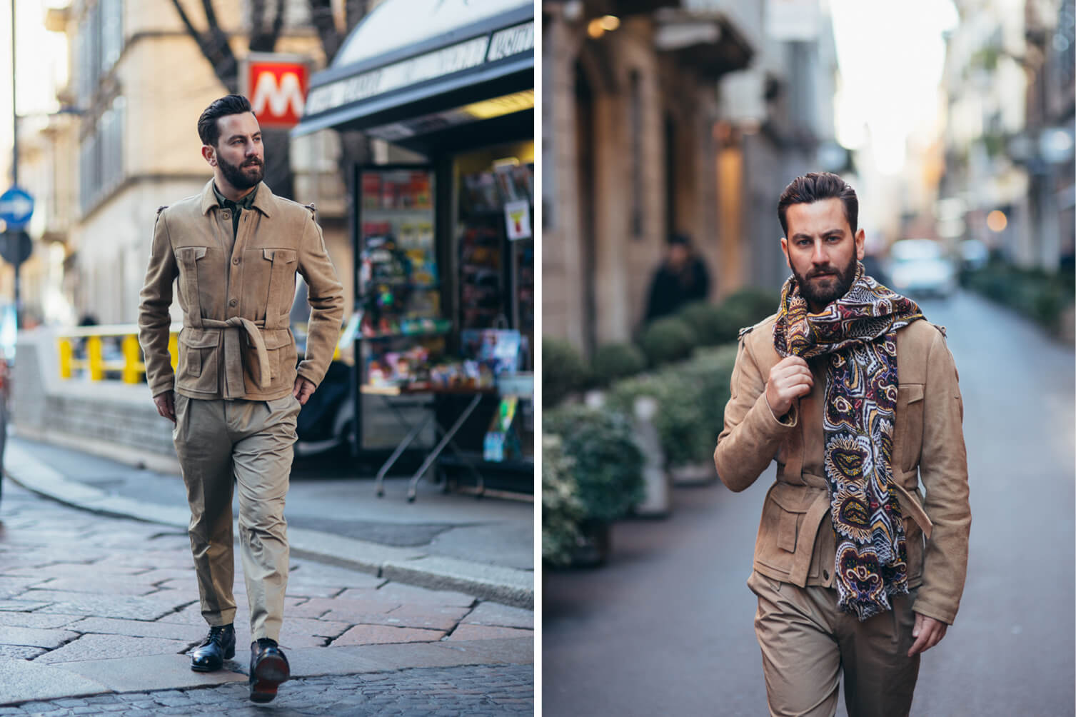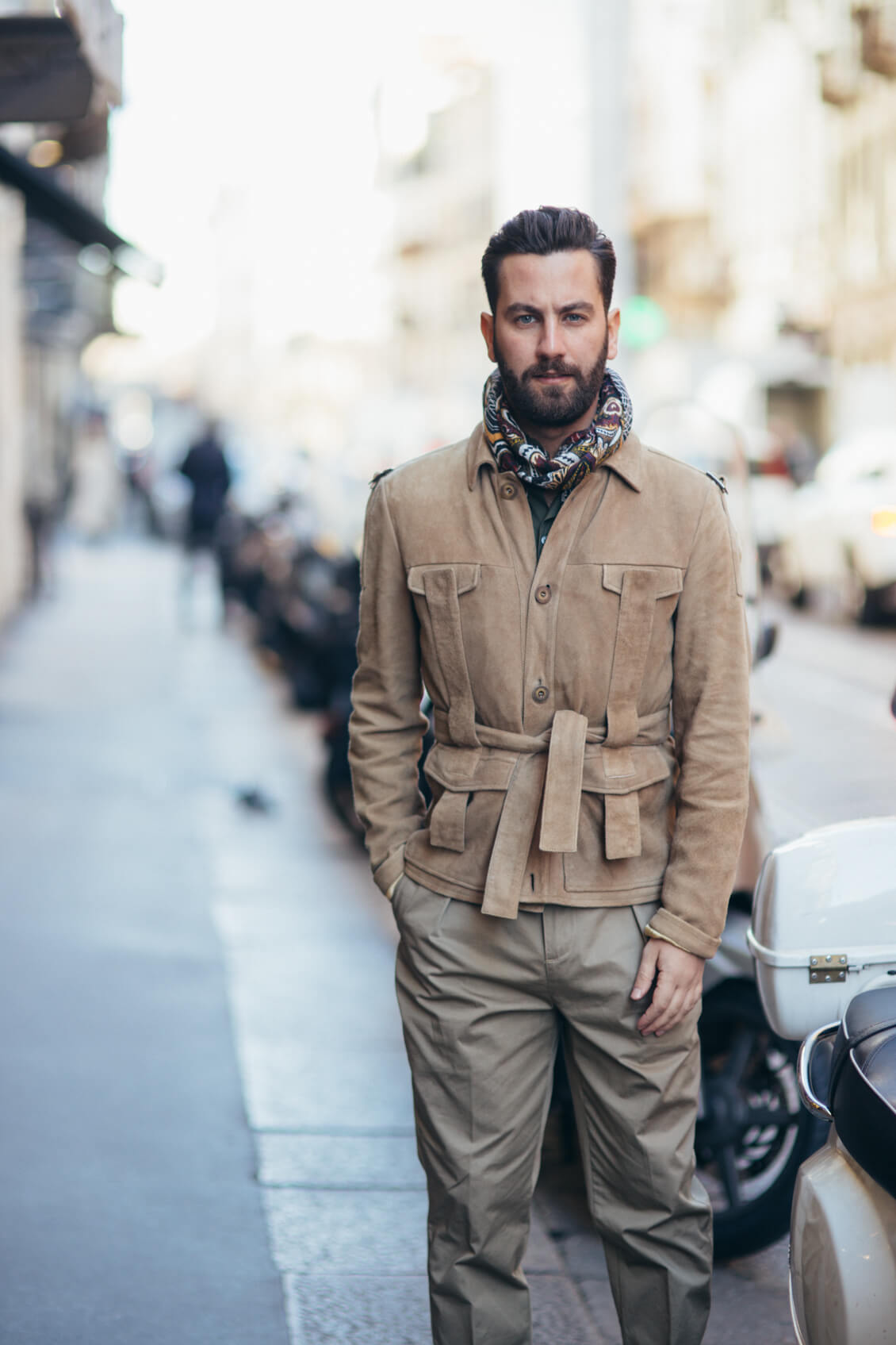 Jacket, Shirt, Scarf and Trousers: Etro, Boots: Santoni