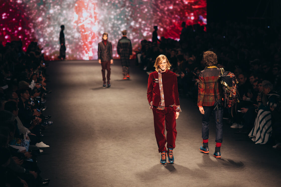 How fitting! Etros show was a perfect ode to earth and nature around us! An attempt to forge space and earth, progressive and classic, both in the show as well as in the collection! Colorful screens, immersive technology and high quality designs all contributed to a mystical atmosphere and experience! With the #EtroSkyIsTheLimit the show was accessible to a wider audience, allowing for people at home to livestream the performance, view exclusive video extras that were produced specifically for the show, while at the same time share there thoughts and reactions of the collection. Heavily inspired by the mountain range of the Himalayas, the collection featured sportswear inspired tailoring in vivid colours and textures. Parkas, puffa jackets and patchwork lifted us up into the sky high mountains!