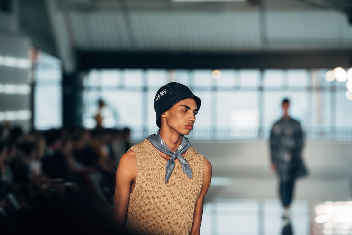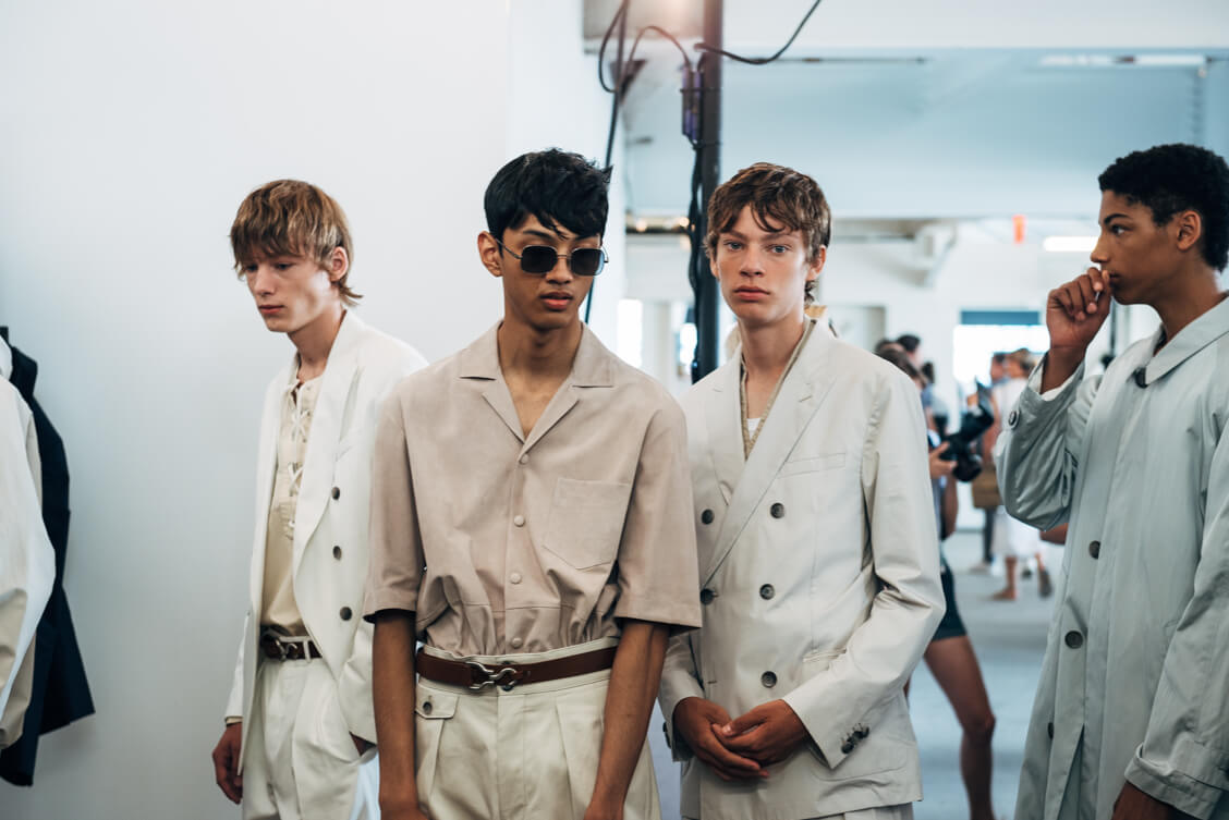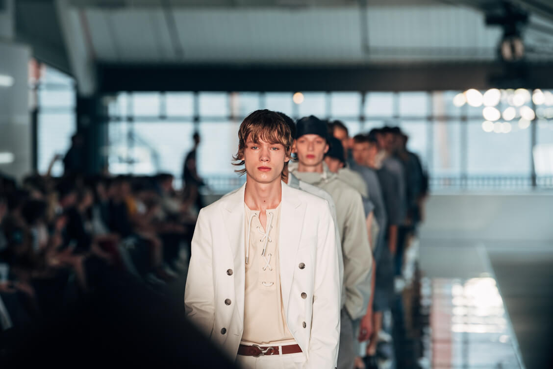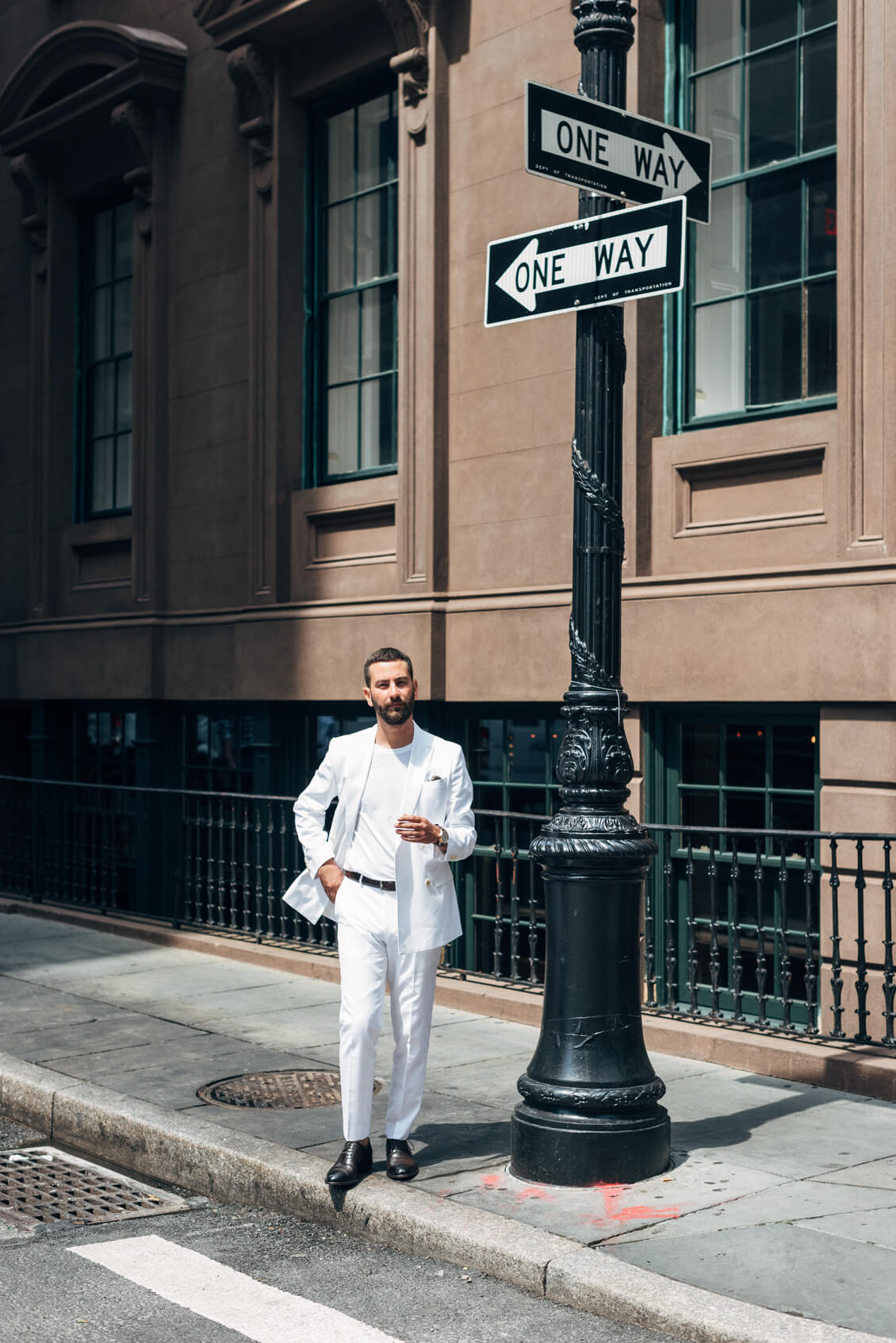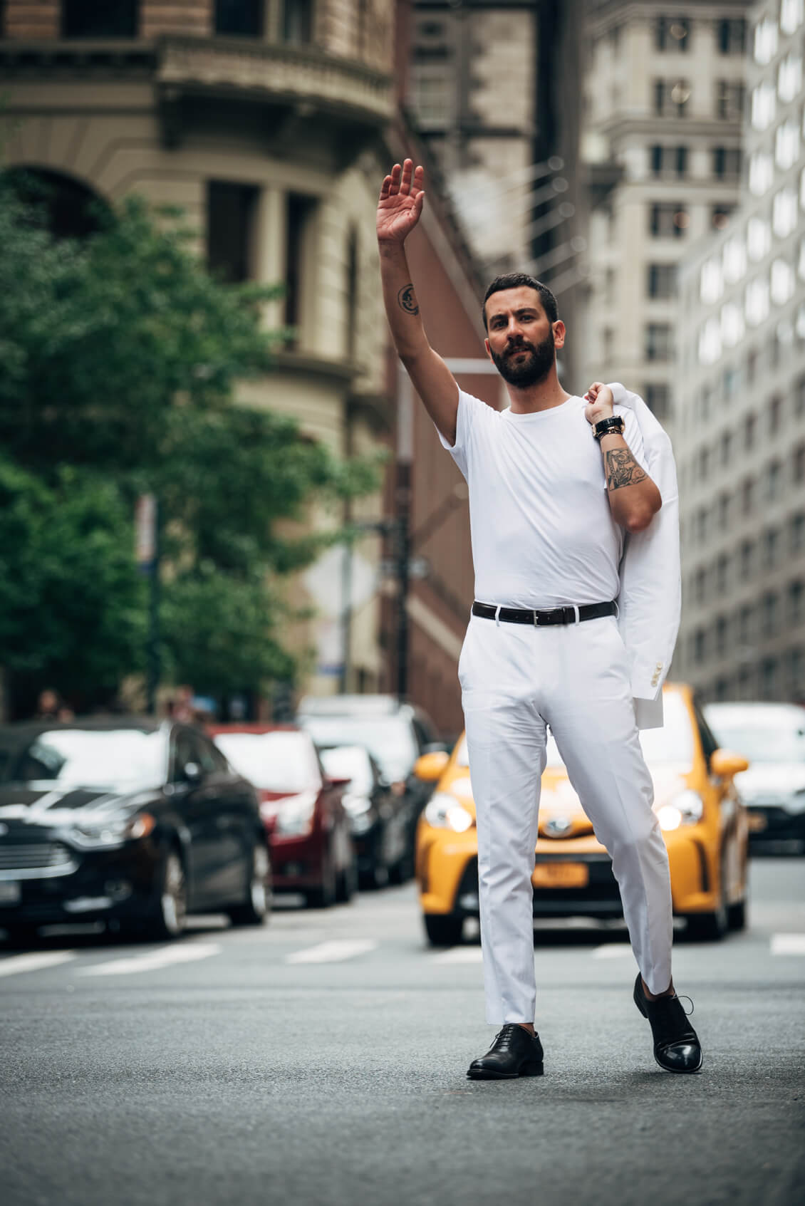 The colour palette of this show amazed me, fused with the fabrics – stone blue suedes, white cotton, silks, all perfectly treated and curated to convey the spirit of the collection. The pops of red on the soles of the shoes is exemplary of the novelty of this collection – weather-beaten hues with stark red. I followed suit – journeying from Mykonos to NYC I brought with me the exact mood that the Summer of Ease conveyed – effortlessly at ease with summer white for the modern man. Top to bottom in a white BOSS double breasted jacket with a t-shirt. Shots of black, belt and shoes added the grunge of the city. Discover the collection HERE.
