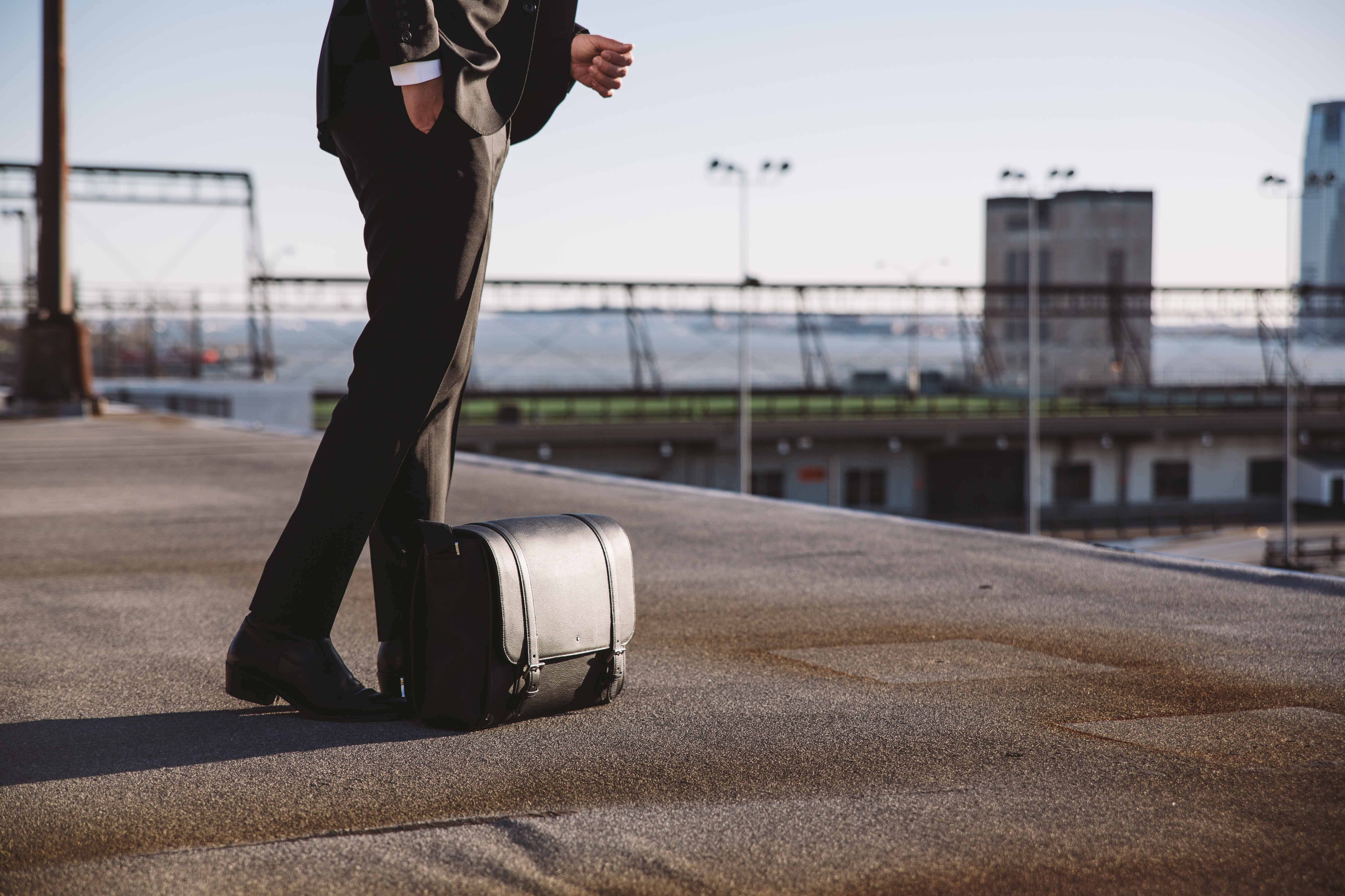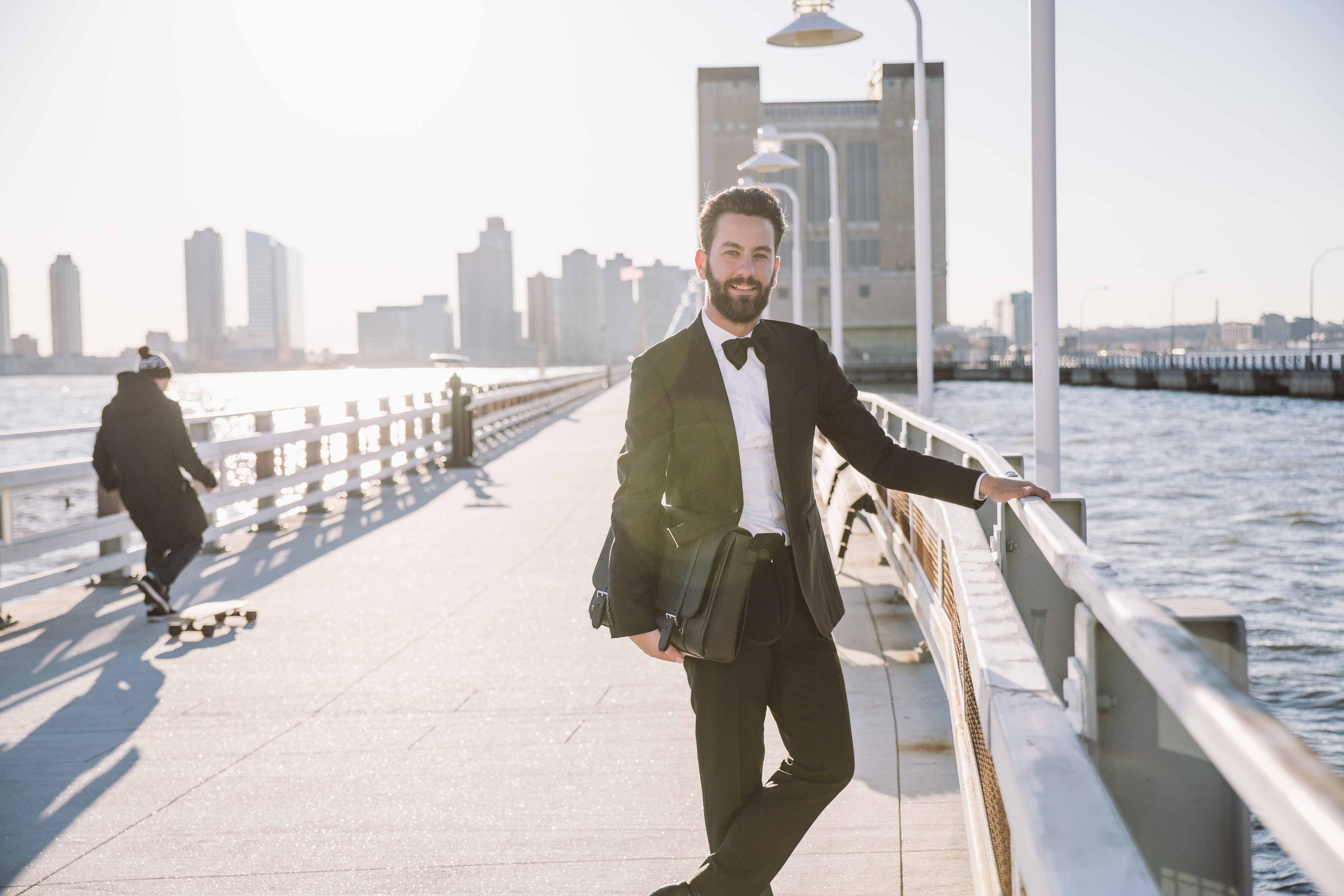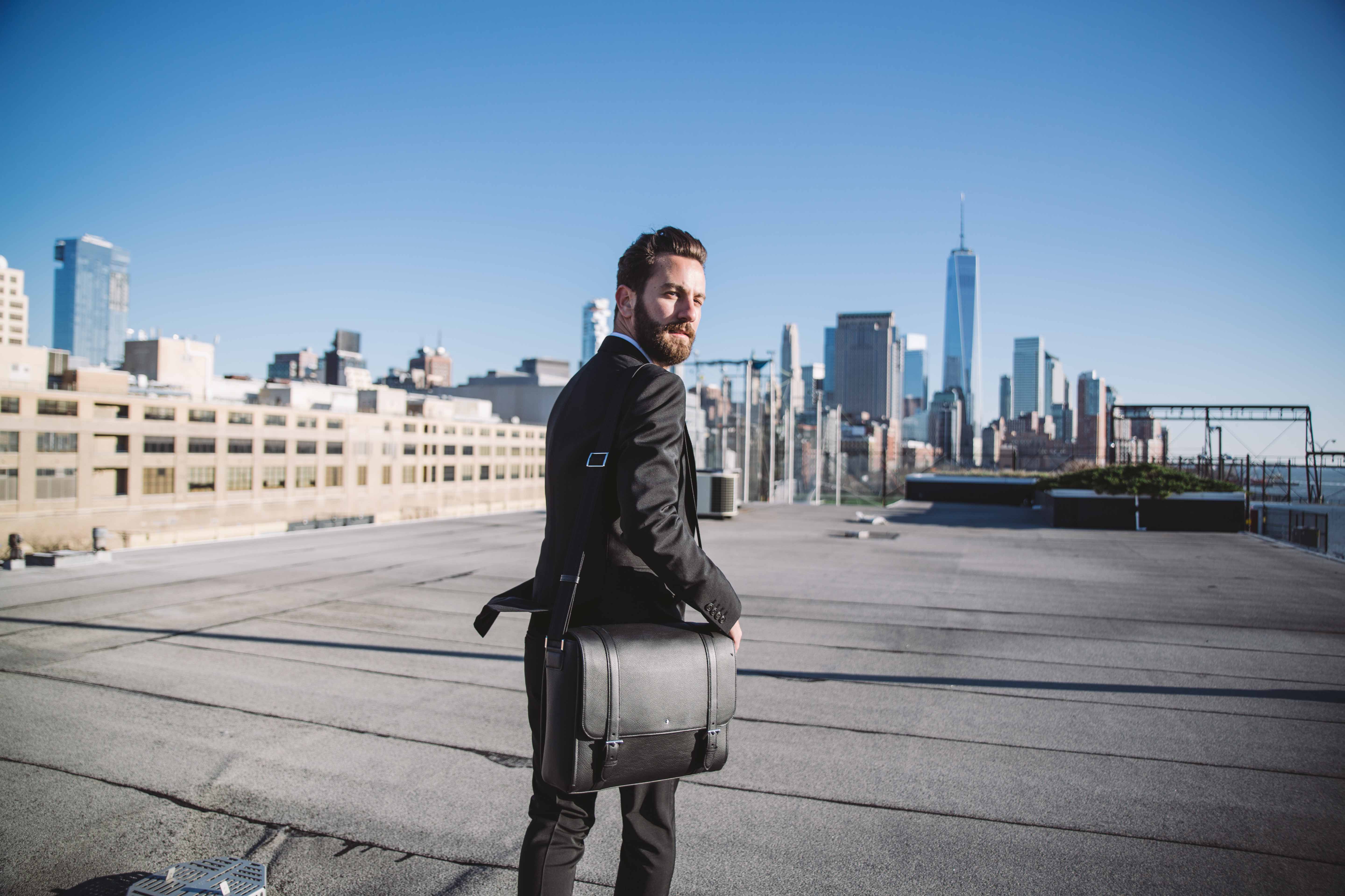 Suit: Burberry, Shirt: Brooks Brothers, Messenger Bag, Cufflinks and Pen: Montblanc Heritage Collection Rouge & Noir, Boots: Sandro