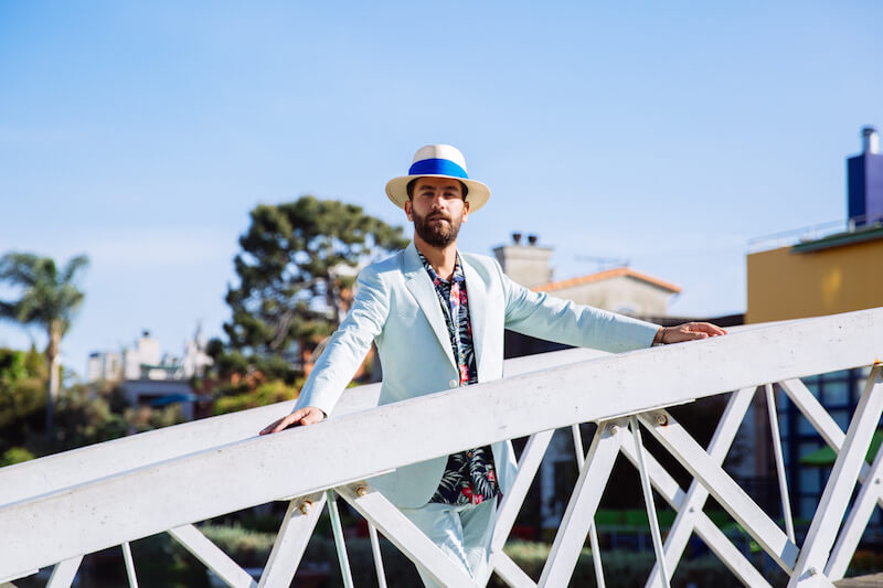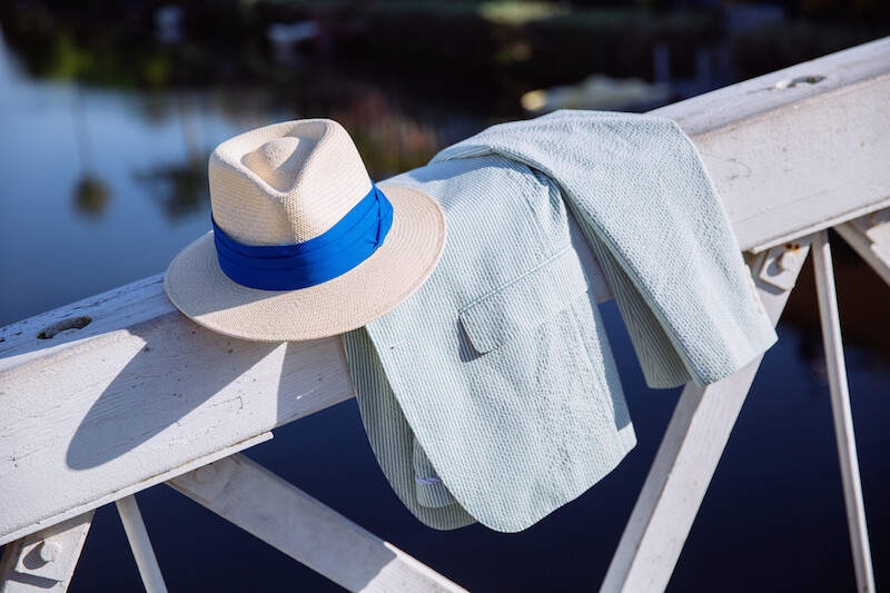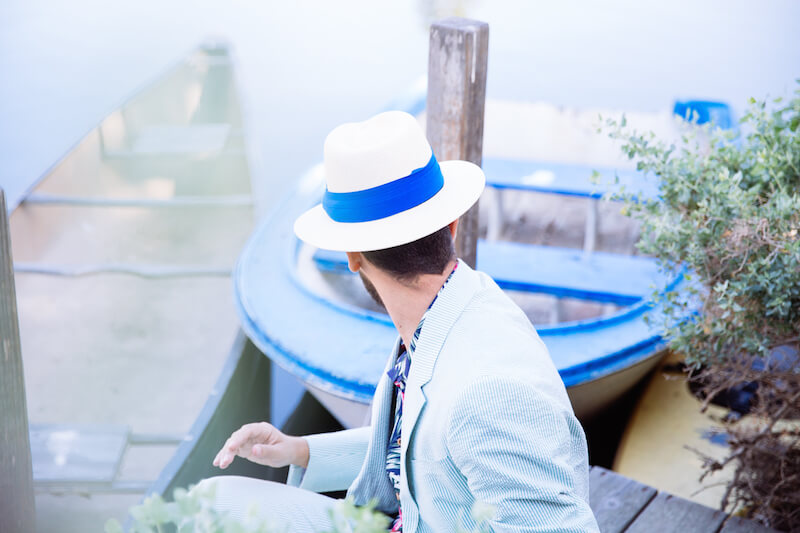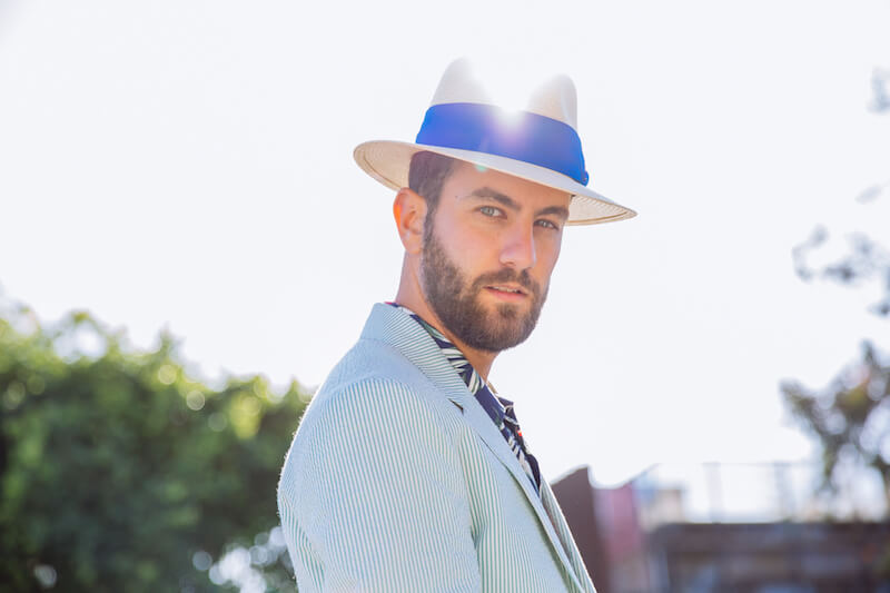 Suit and floral shirt: Haspel Clothing, Panama hat: Bailey, Sneakers: Axel Arigato