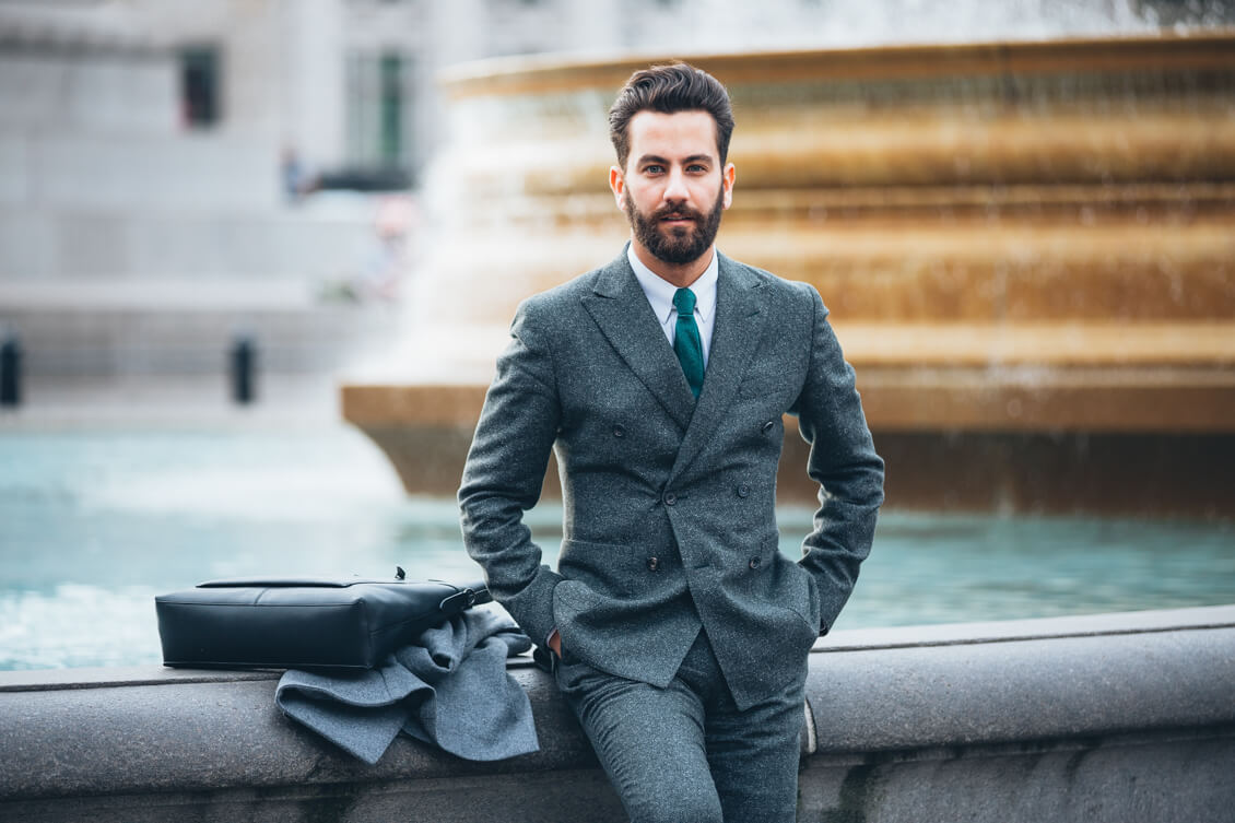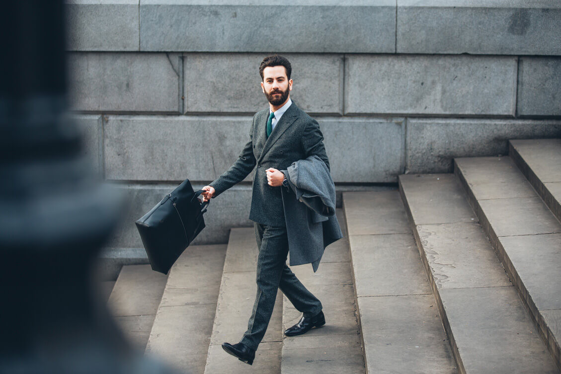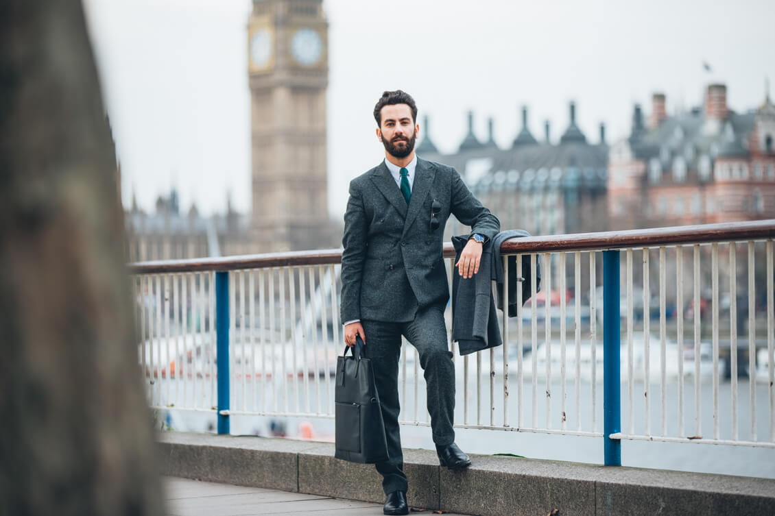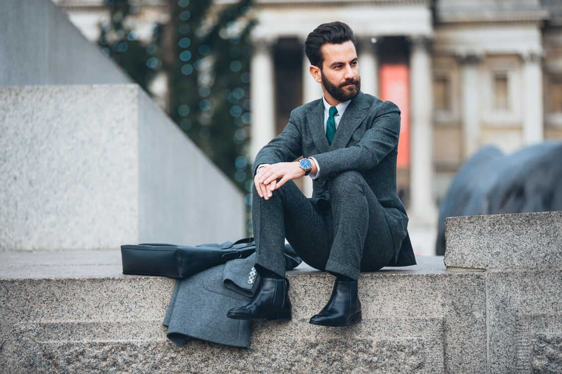 Suit, Coat and Tie: Hardy Amies, Shirt: Brooks Brothers, Boots: Sons of London, Bag: Coach, Sunglasses: Cutler&Gross