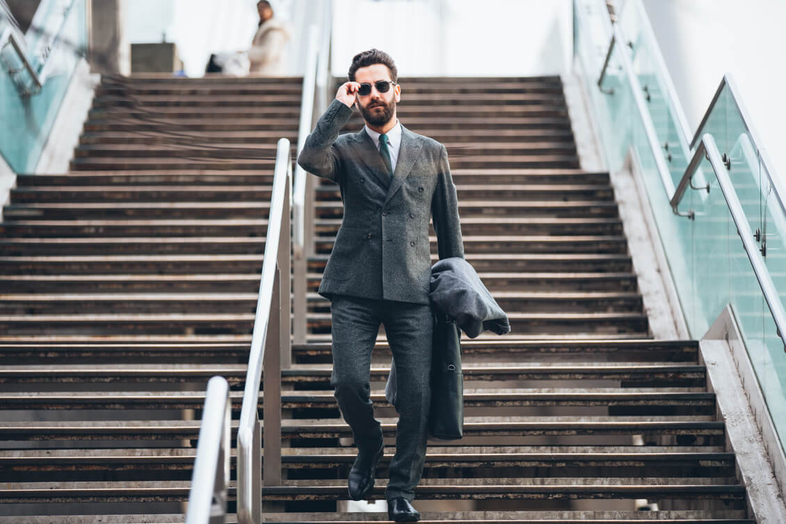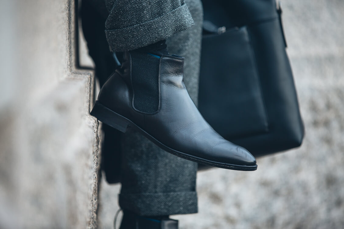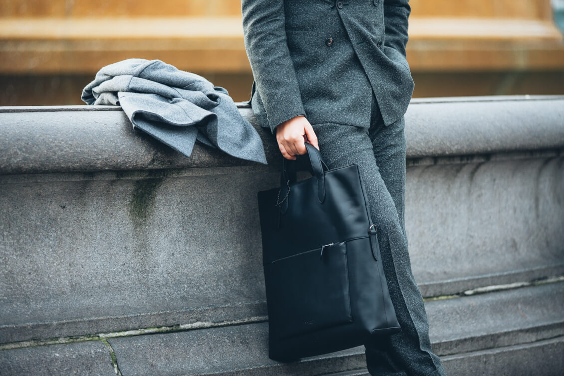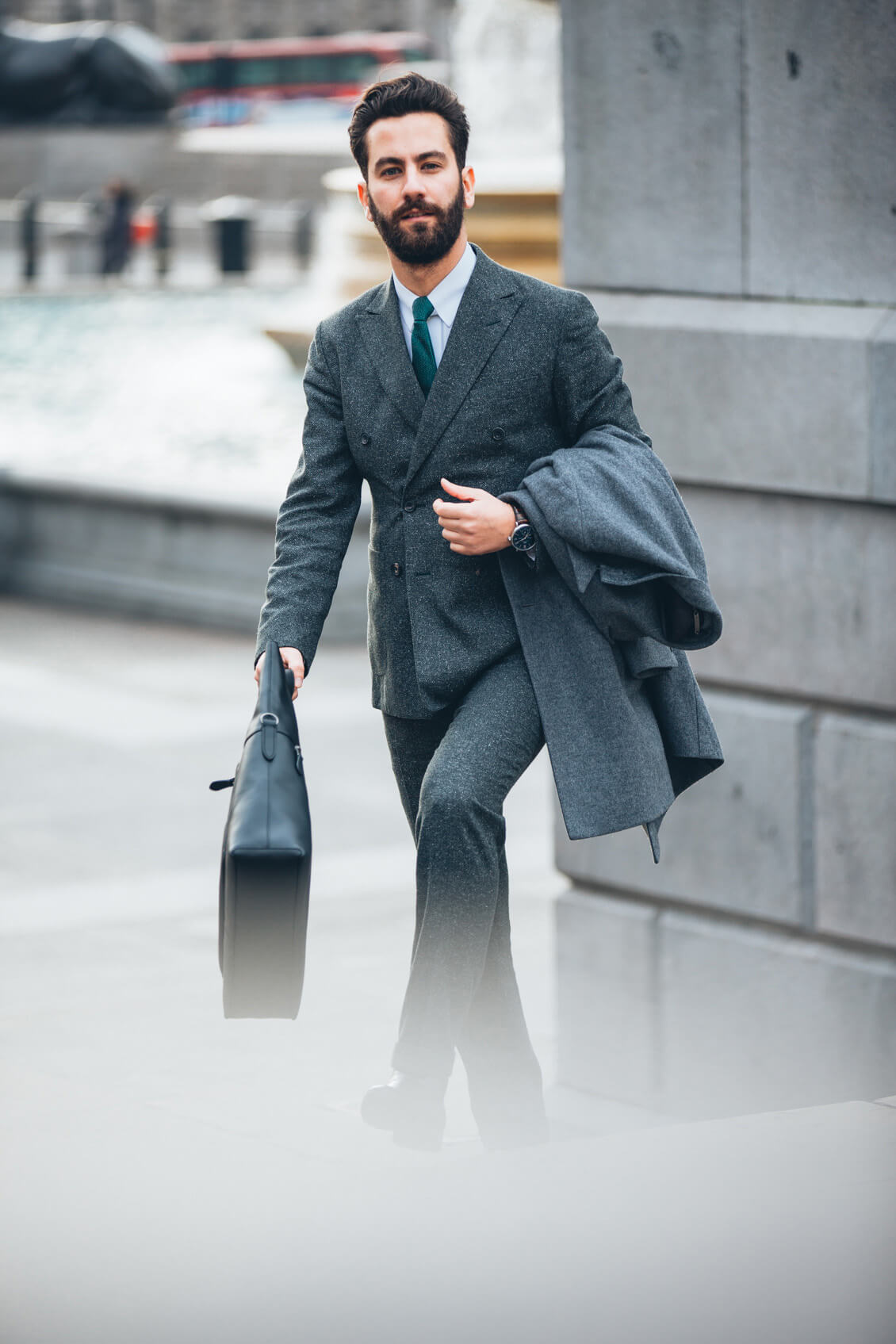 Suit, Coat and Tie: Hardy Amies, Shirt: Brooks Brothers, Boots: Sons of London, Bag: Coach, Sunglasses: Cutler&Gross