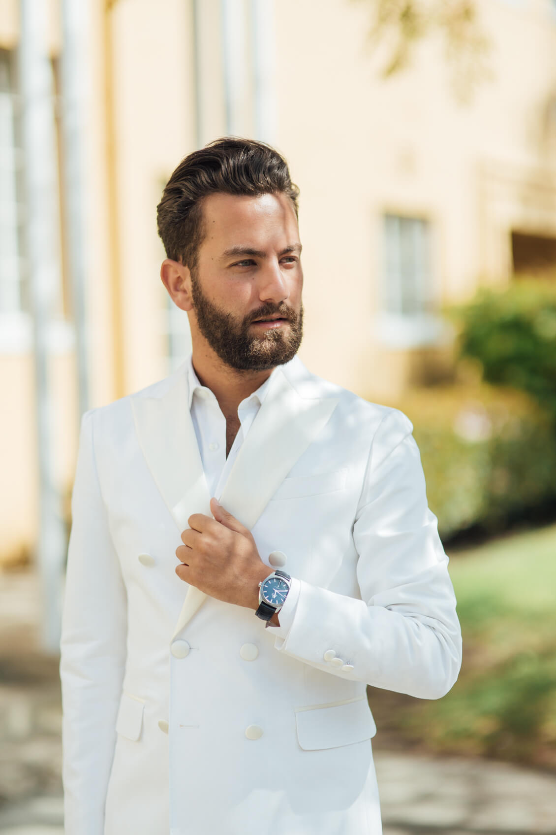 Suit and sneakers: Dsquared2, Watch: OMEGA, striking steel and leather Globemaster