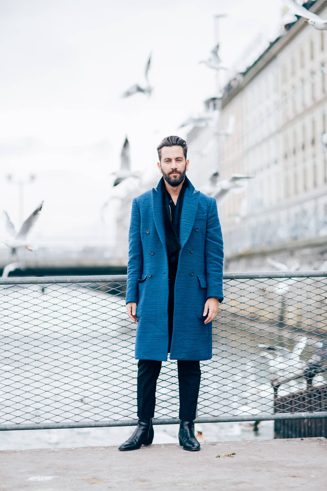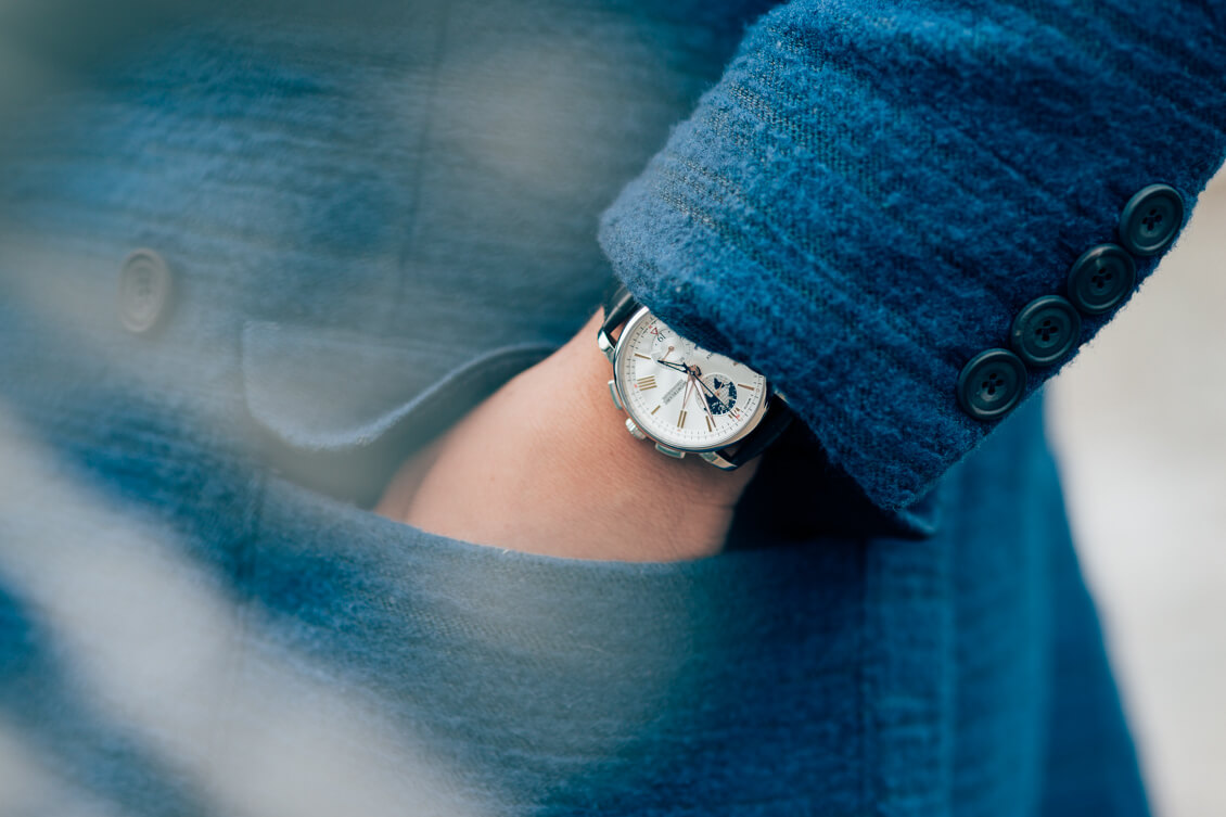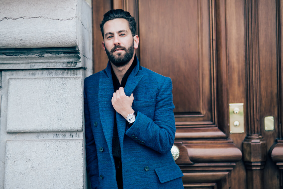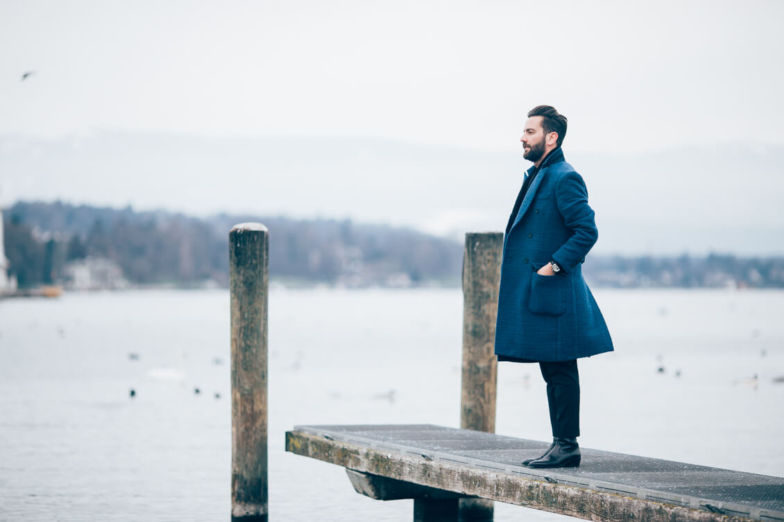 Coat: Hardy Amies, Knitwear: Dolce&Gabbana, Trousers: Dsquared2, Boots: Sandro, Watch: The Montblanc 4810 TwinFly Chronograph 110 years Edition