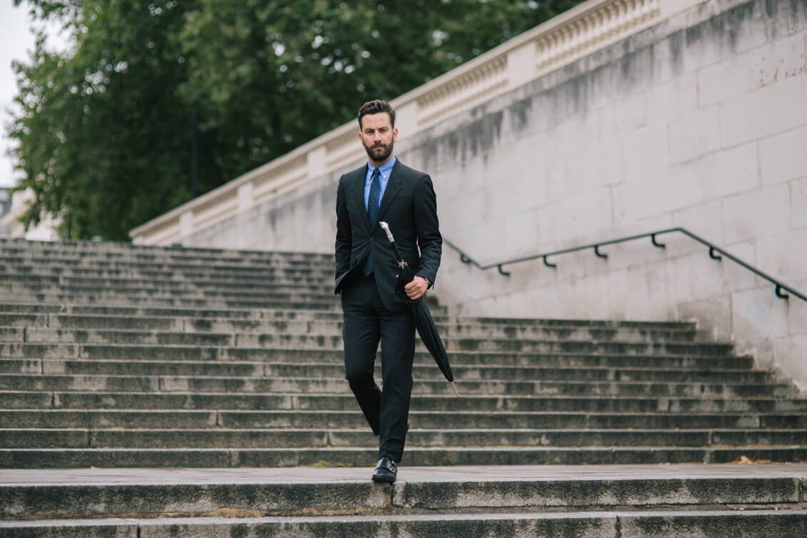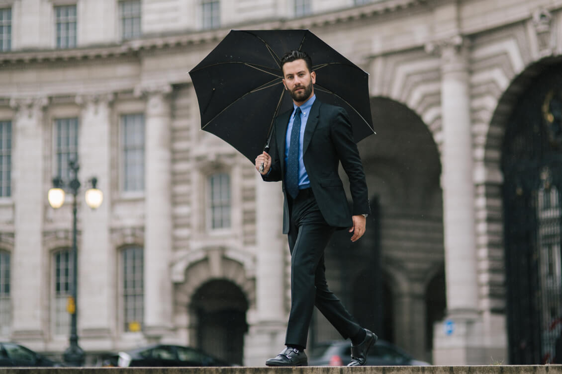 Suit: Burberry, Shirt: Brooks Brothers, Tie: John Varvatos, Shoes: Sons of London, Umbrella: Pasotti, Watch: IWC Pilot