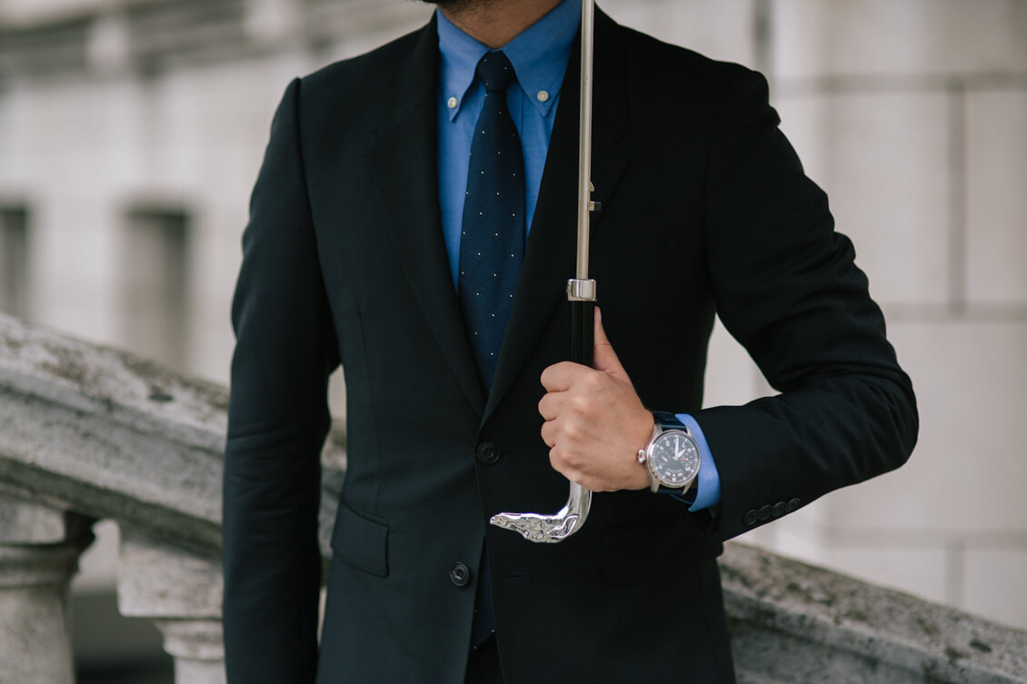 I matched this one of a kind timepiece with a Burberry classic black suit, a Brooks Brothers shirt and a classic John Varvatos tie. A pair of double monk strap shoes from Sons of London fitted impeccably with my neat suit style. As a true Londoner for the past ten years, I always carry an umbrella, so I finished my outfit off with a Passoti one.