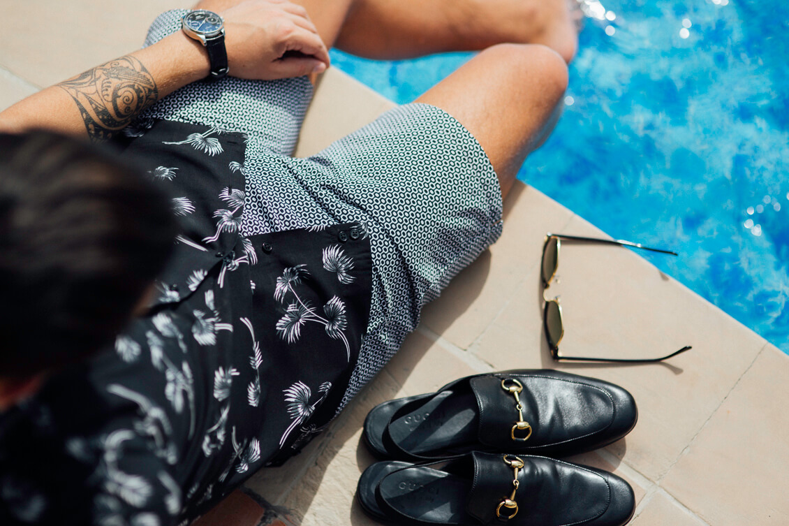 Shirt: Sandro, Swim-shorts: Frescobol Carioca, Loafers / Sandals: Gucci, Backpack: Coach, Sunglasses: RayBan, Watch: IWC