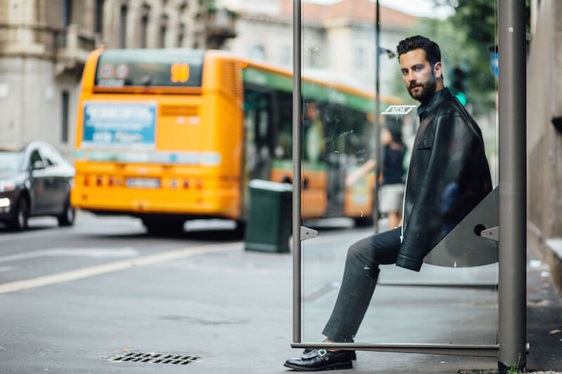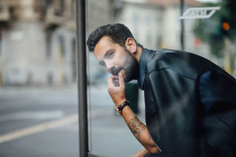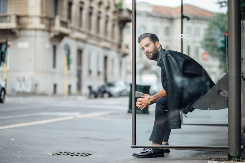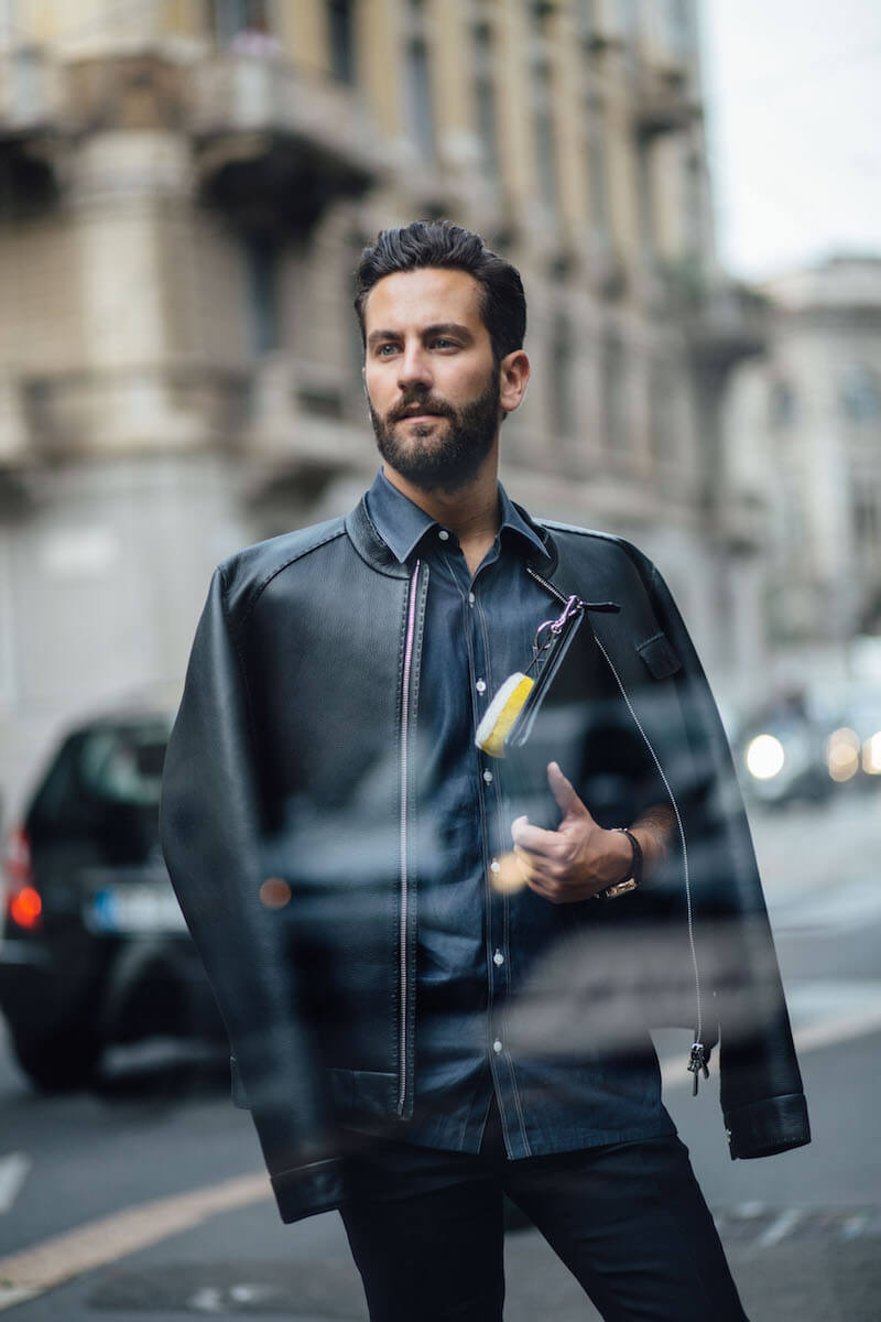 Leather jacket, Denim shirt and Folio: Fendi, Trousers: Dsquared2, Shoes: Brooks Brothers, Watch: Faberge